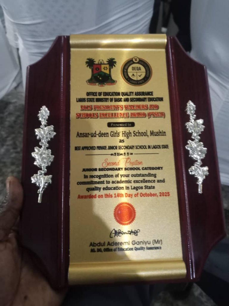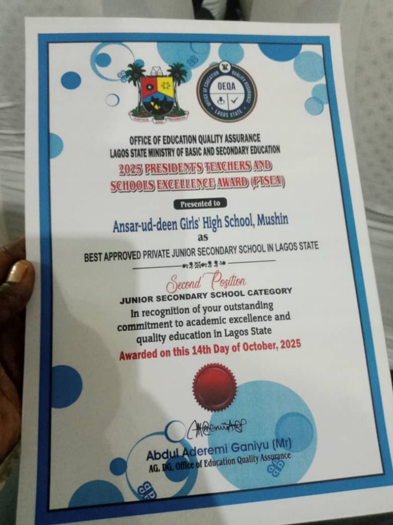Ansar-Ud-Deen Girls’ High School, Itire, Lagos decorated with the President’s Teachers and Schools Excellence Award as Second Best Approved Junior Secondary School in Lagos State today 14th October, 2025🥳🥂🎈🎉🎊🪅